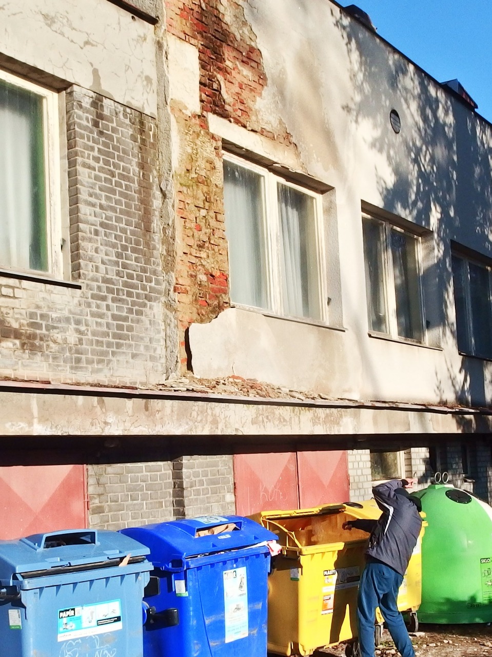 Stačilo pár desítek centimetrů a občan třídící odpad u bývalého kulturního domu ve Starém Rožmitále mohl skončit - v lepším případě - v nemocnici. Odfouklá omítka hrozí každou chvíli zřícením nejen nad kontejnery, ale podél objektu i na ulici.