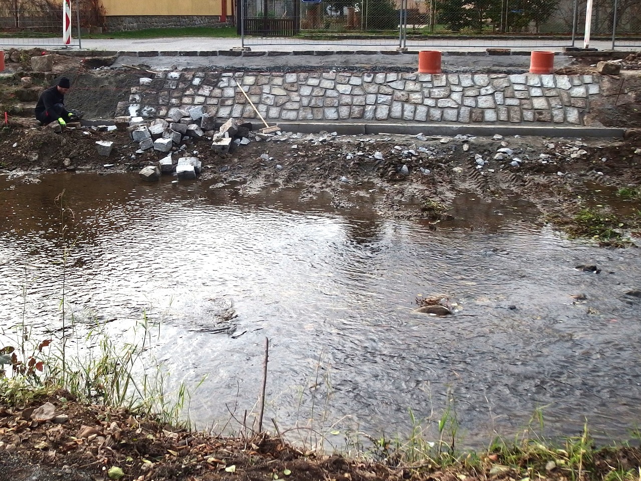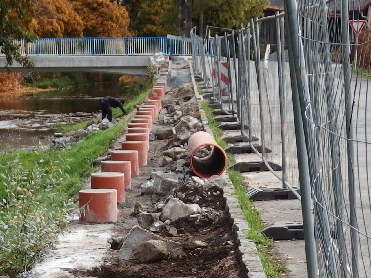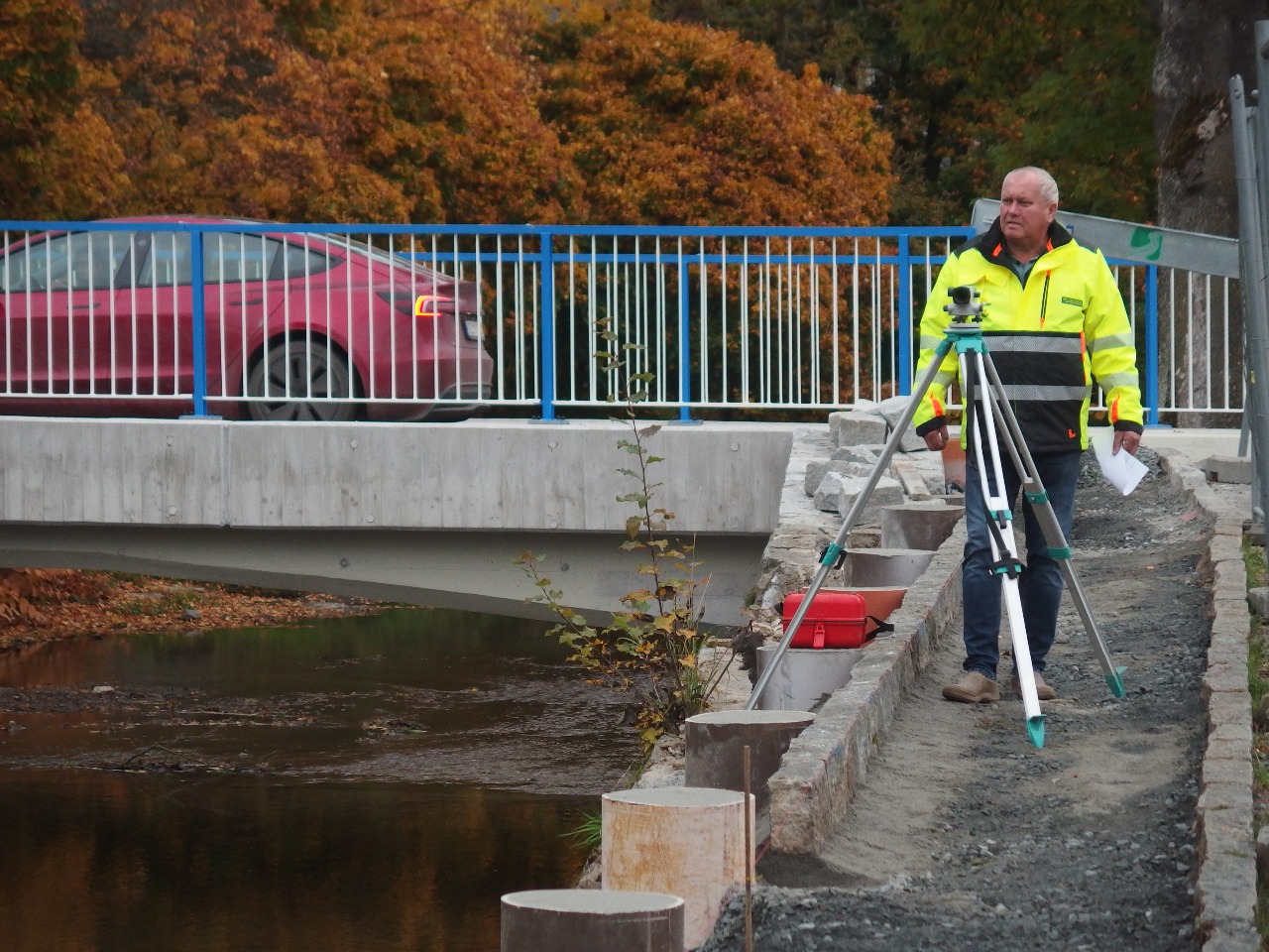 Na mostě už chybí jen drobnosti, ale staví se kolem něj. Dodatek ke smlouvě totiž obsahuje zhotovení nového zábradlí a chodníku na nábřeží od mostu až po první sloup veřejného osvětlení a vybudování pořádné cesty ke sportovnímu areálu. Rovněž se staví nový taras na pravém břehu v místě, kde stál provizorní most.