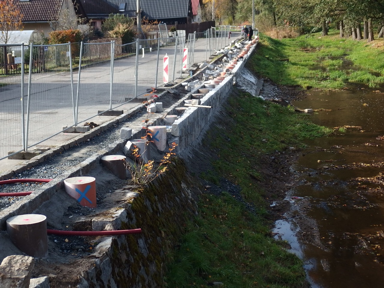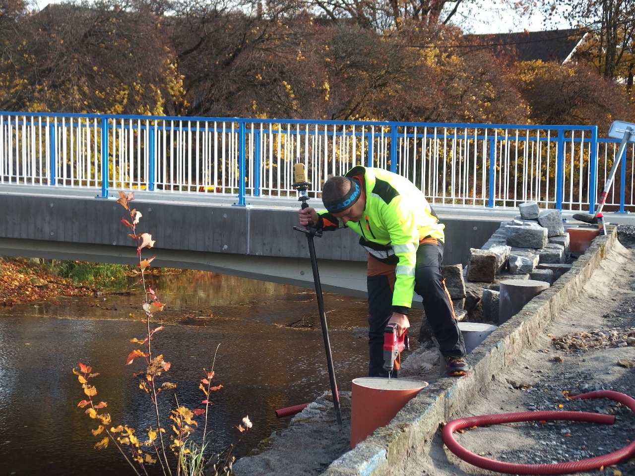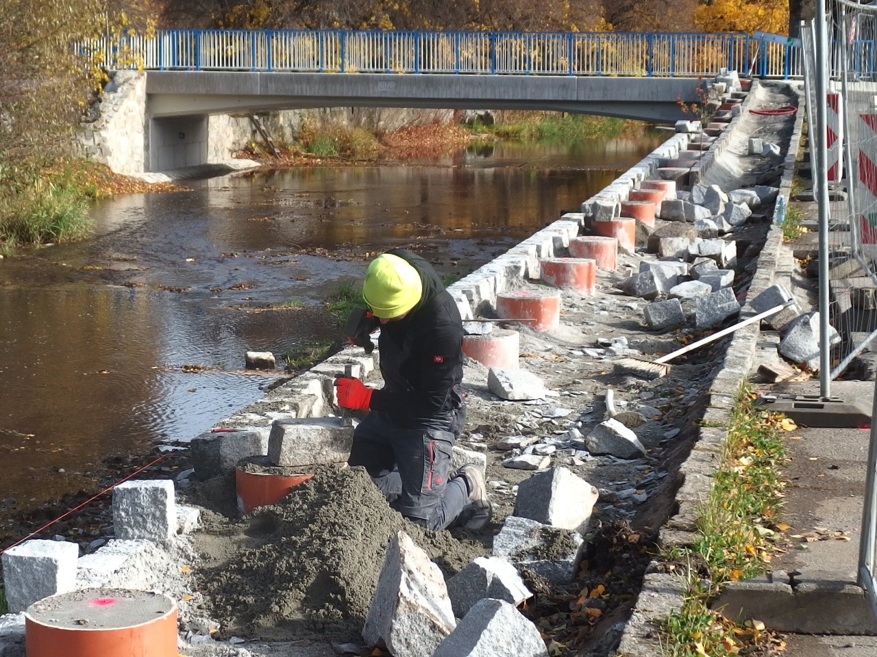 Sice je okolo stavby relativní klid, ale je to klid jen zdánlivý. Stavebníci se nyní soustřeďují na vyzdění tarasu na nábřeží, aby poté mohli dokončit chodník a na něj postavit zábradlí. Kde zapustit patky, to jim ve čtvrtek označil příbramský geodet.