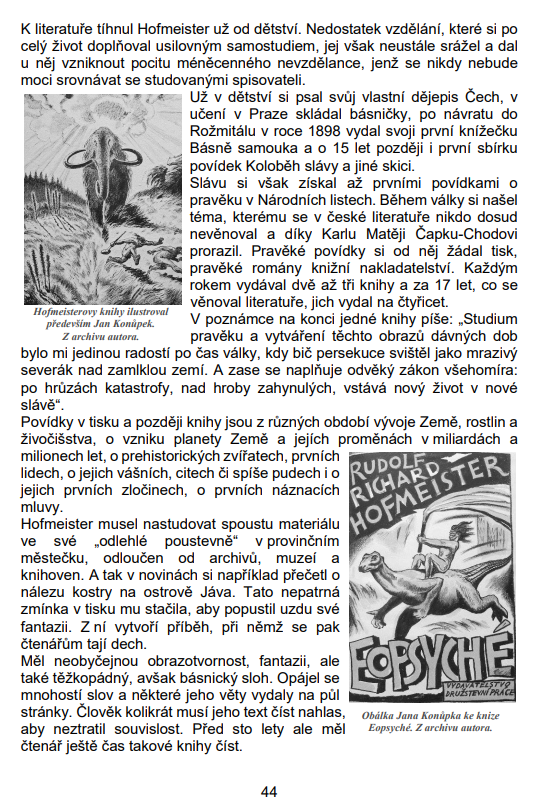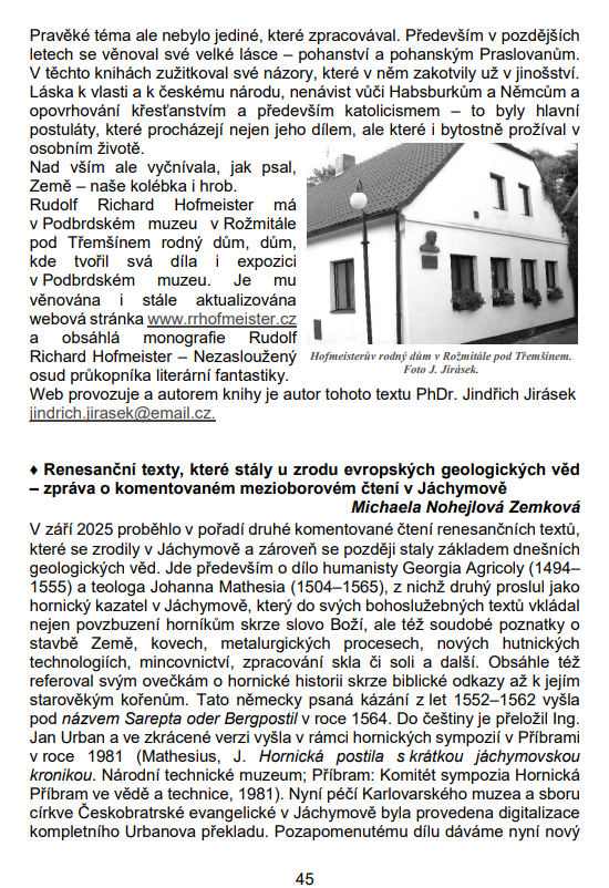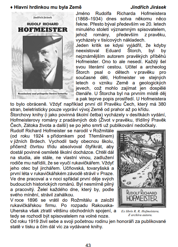 Pod tímto názvem otiskl Zpravodaj České geologické společnosti stať o rožmitálském spisovateli Rudolfu Richardu Hofmeisterovi (1868 - 1934). Psal knihy a povídky z různých období vývoje Země, rostlin a živočišstva, o vzniku planety Země a jejích proměnách v miliardách a milionech let, o prehistorických zvířatech i o prvních lidech.