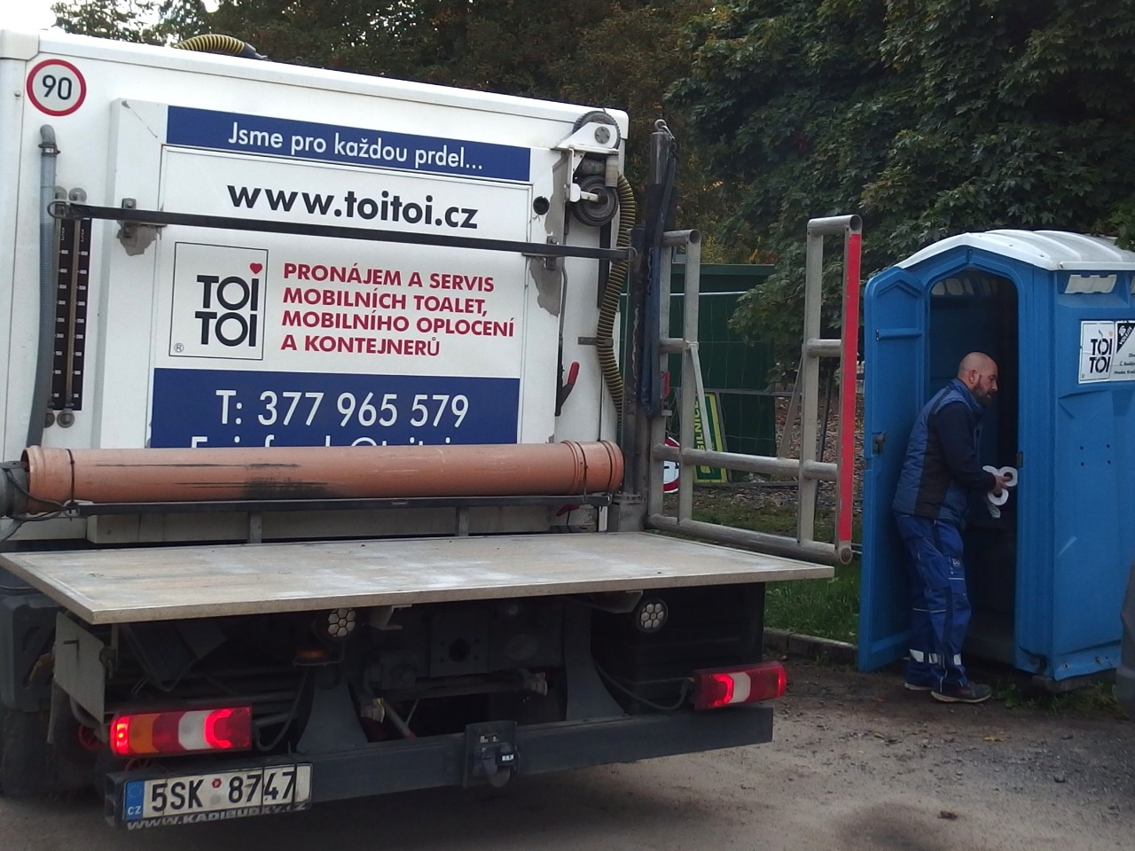 Mobilní kadibudky jsou vidět na mnoha místech v Česku, třeba i na staveništi nového mostu ve Starém Rožmitále. Chemický záchod firma nejen přiveze, ale ještě se o něj průběžně stará, jak dokumentuje náš snímek právě ze Staráku.