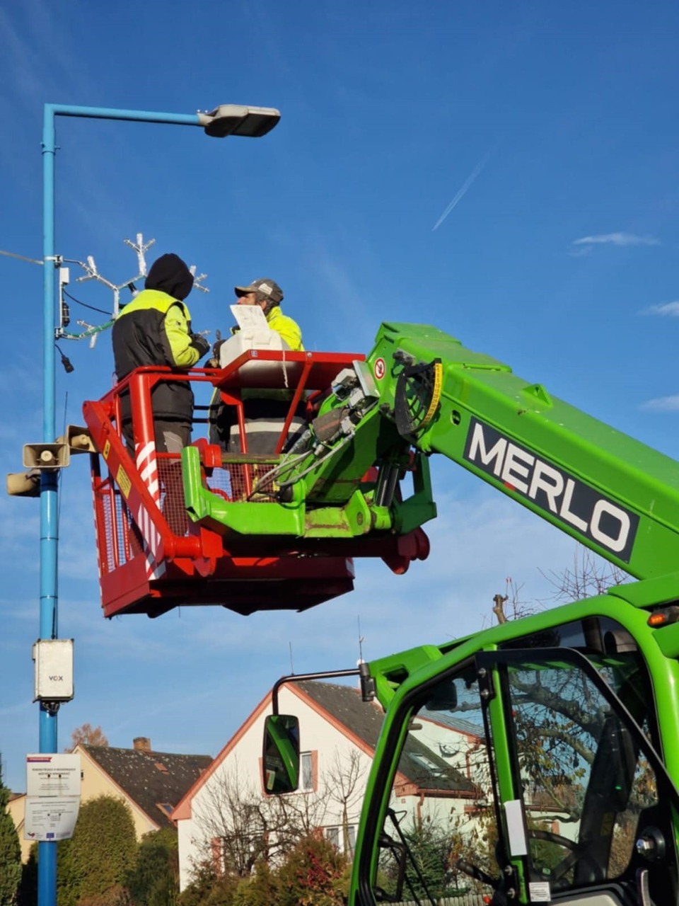Titulek je nesmyslný pouze zdánlivě. V pátek přidělávali pracovníci technických služeb a Atelieru Maur v Rybově ulici k veřejnému osvětlení vánoční výzdobu, a i když vločky ještě nesvítí, už dělají parádu. Pomalu jim stačí jen světlo z lamp. A co teprve až se o prvním adventu rozsvítí!