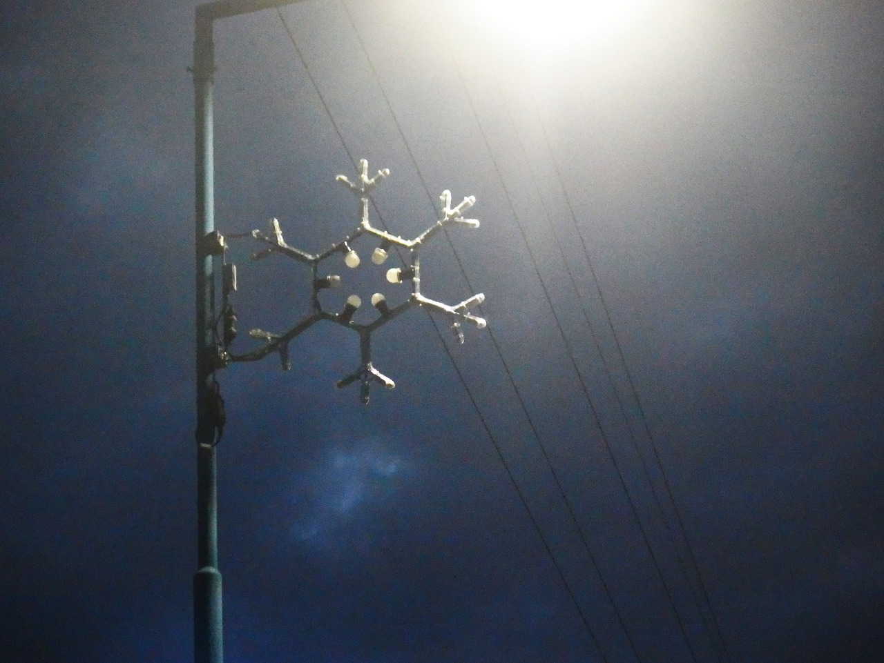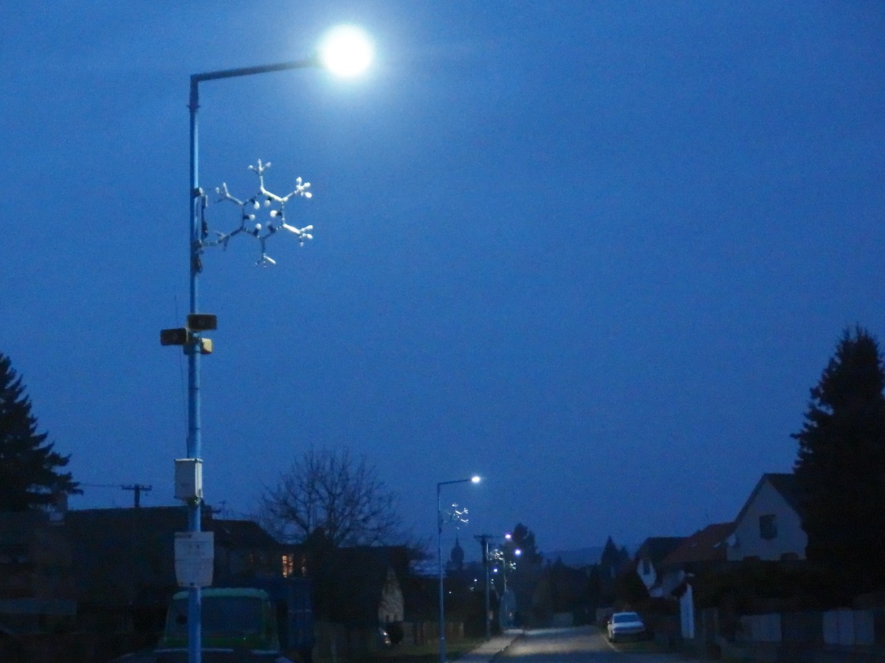 Titulek je nesmyslný pouze zdánlivě. V pátek přidělávali pracovníci technických služeb a Atelieru Maur v Rybově ulici k veřejnému osvětlení vánoční výzdobu, a i když vločky ještě nesvítí, už dělají parádu. Pomalu jim stačí jen světlo z lamp. A co teprve až se o prvním adventu rozsvítí!