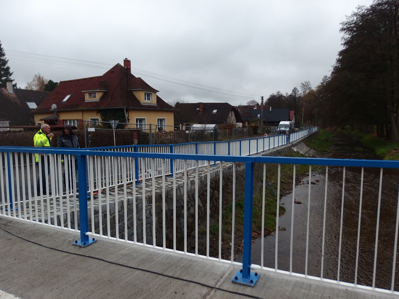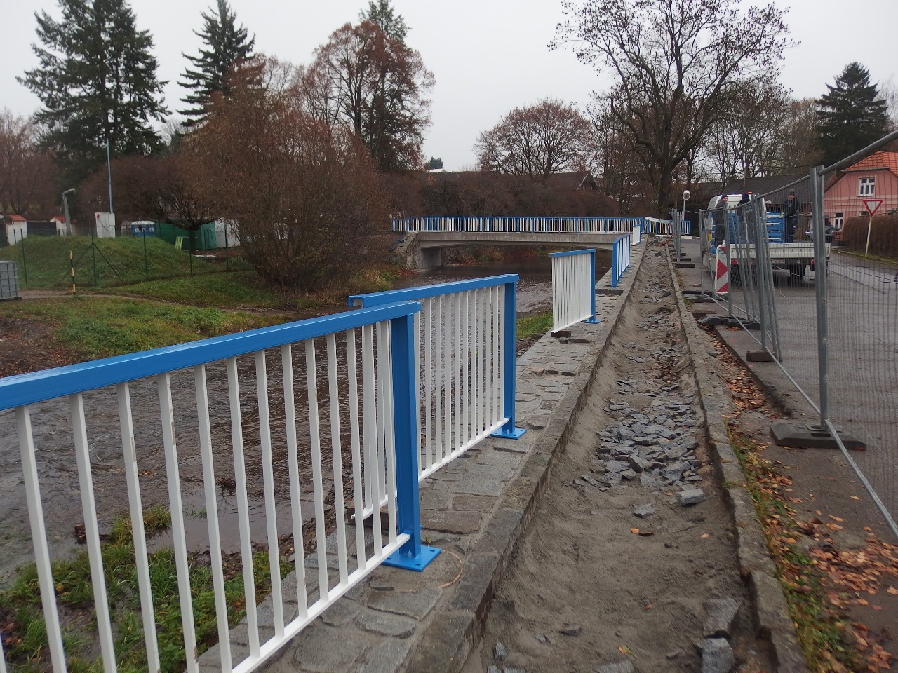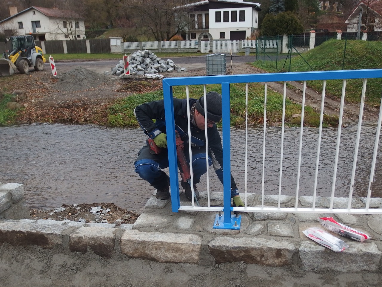 Modrobílé zábradlí podél Nábřeží Bartoloměje Sadílka ve Starém Rožmitále už stojí. Do tarasu jej včera zakotvili pracovníci firmy Porr, která ho také ve svých dílnách v Sedlčanech vyrobila. Zároveň byla postavena i chybějící část zábradlí na levém břehu Vlčavy před mlýnem. Zábradlí na mostě instalovala stejná firma 13. srpna.
