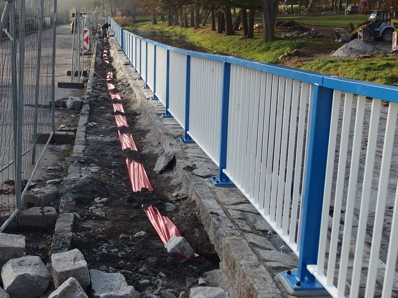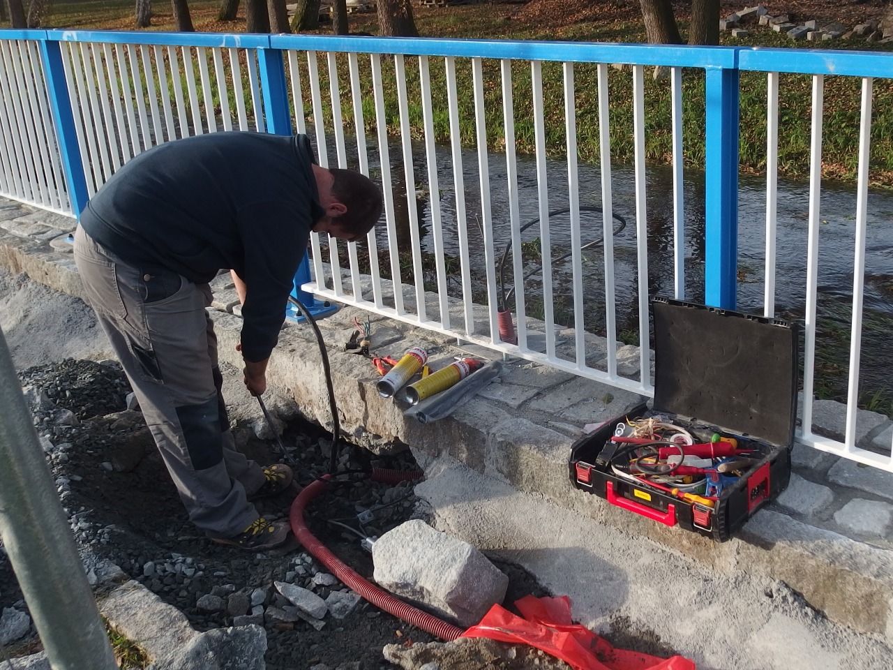 Všechno spěje k tomu, že se u nového zábradlí podél Nábřeží Bartoloměje Sadílka objeví dvě pouliční lampy. Na jejich instalaci se podílejí rovněž městské technické služby, jejichž pracovníci si sem dneska „odskočili“ od jiných pouličních svítidel, a to v Rybově ulici. Tady tento týden vyváděli na stožárech elektrické přípojky pro namontování vánoční výzdoby.
